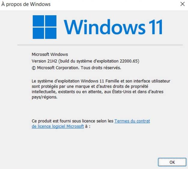 C’est alors qu’une jolie fenêtre apparaitra avec la version de votre Windows 11 :